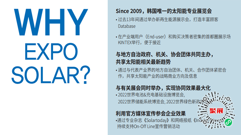 韩国太阳能光伏及新能源展览会(EXPO SOLAR)是韩国唯一一个专业的太阳能博览会。是100%的太阳能专业企业参展和专业观众参观,在提高太阳能相关产品的宣传集中度的同时,十分容易的在现场实现目标客户洽谈及营销。EXPO SOLAR是海外企业进军亚洲太阳能市场的重要窗口,每年海外参展企业和专业观众都在急速增加。