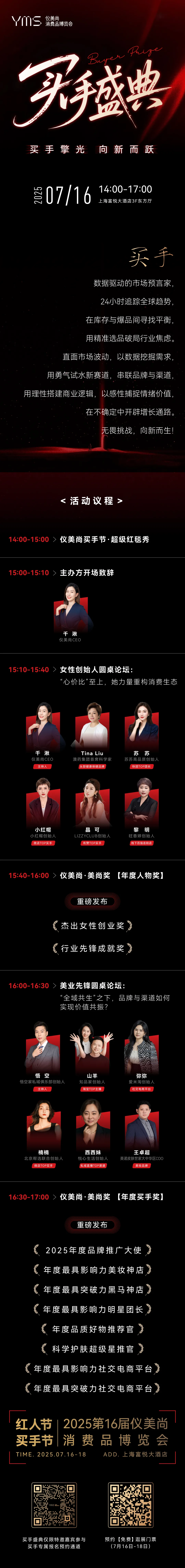 由买手、红人带来的精彩纷呈的活动之余,7月17—18日,“第十六届仪美尚消费品博览会·全球美妆消费品精品展”,以及“百大渠道展:渠道买手专场+超红KOL专场”两场行业展会将同步展开。与此同时,还有十余场特备活动,助力产业链上、中、下游玩家,精准链接优质资源。