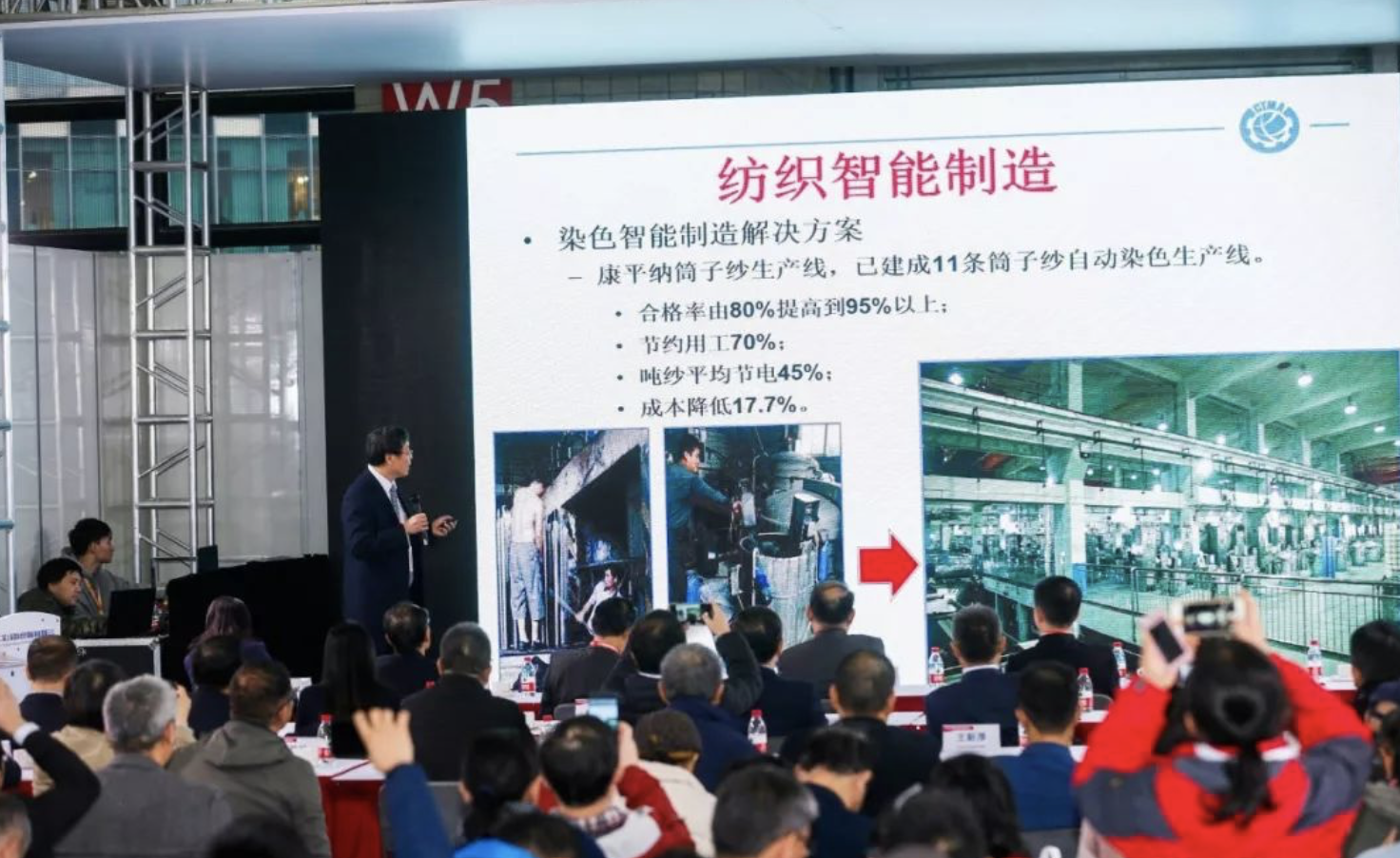 展会开幕当日举办的上海国际纺织智能制造高峰论坛紧扣“纺织”与“智造”,“跨界+纺织”为切入点,带来涵盖棉纺、染整、针织、化纤全领域的智能制造示范项目经验分享,剖析智能制造在纺织行业落地痛点,并配套在W5馆设置的纺织智能制造专区进行实体展示,引领工业4.0在纺织行业的落地。