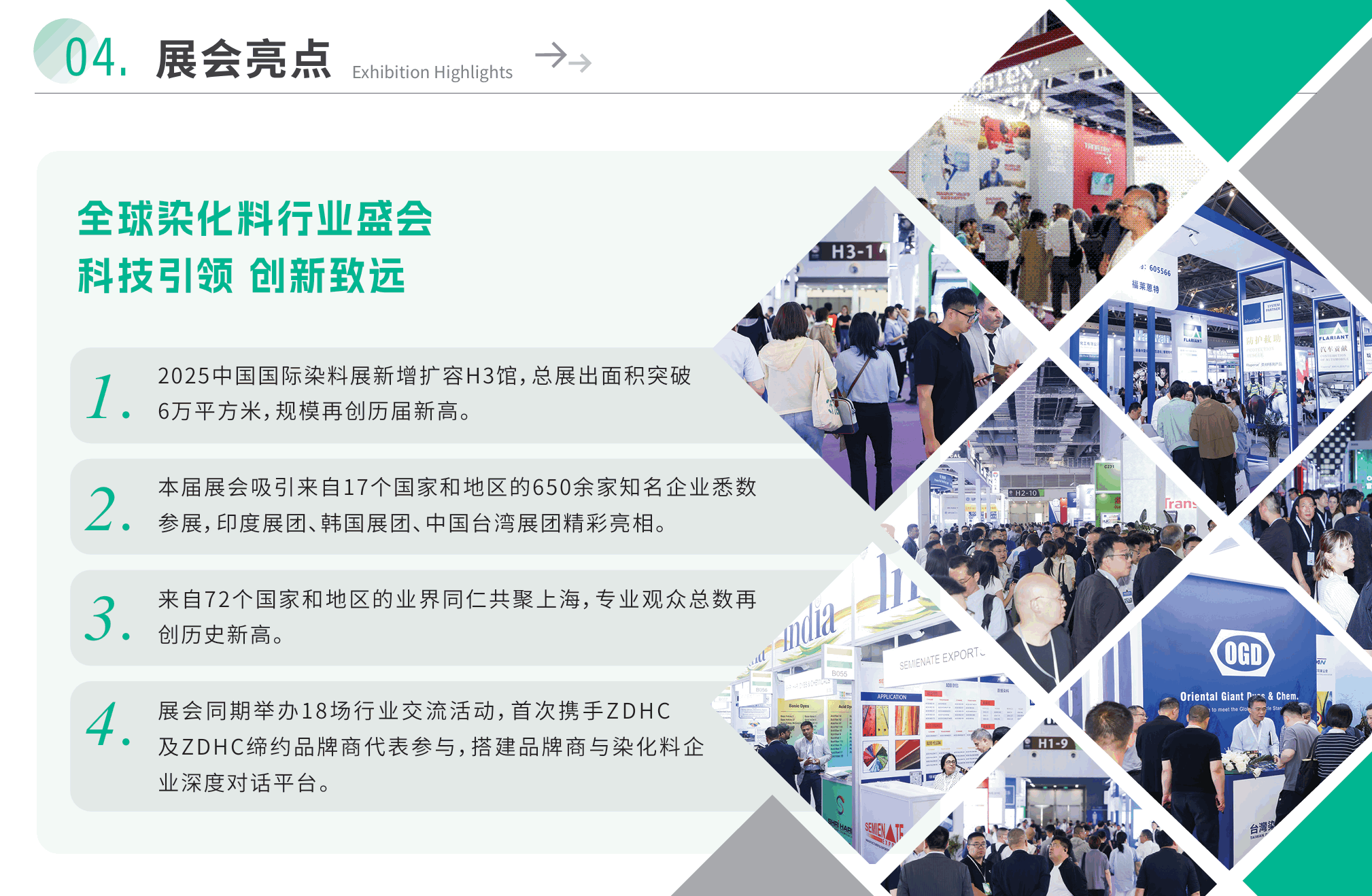 上海国际染料工业及有机颜料、纺织化学品展览会(CHINA INTERDYE)紧随行业发展,汇聚了国内外知名企业,包括昂高、拓纳、佳和、鲁道夫等,集中展示低碳、环保染料纺织化学品,为行业绿色健康发展注入新的动力。(本文内容版权归属聚展所有,未经同意,禁止转发)
