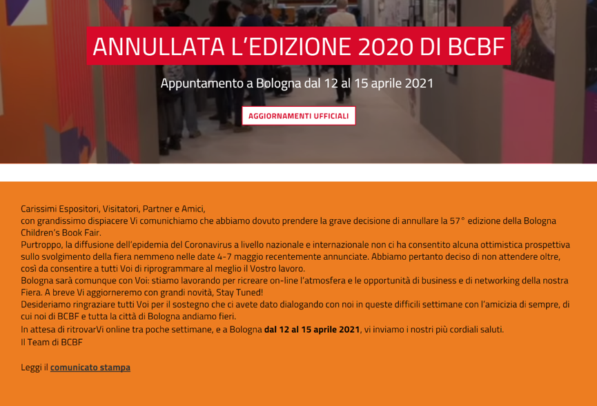 博洛尼亚国际童书展(Bologna Children's Book Fair)取消公告。图片为官网公告截图。