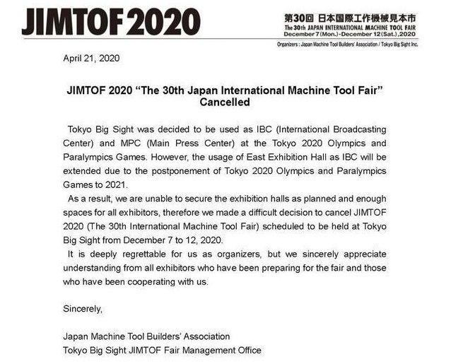 因此,主办方无法确保按原计划为所有参展商提供足够的展览面积,不得不做出一个艰难的决定,取消原定于2020年12月7日至12日举办的第30届JIMTOF。