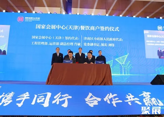 天津国家会展中心餐饮商户签约仪式于8日举行。仪式上,天津国家会展中心与津南区小站镇人民政府签署战略合作协议。同时,24家知名餐饮品牌企业签约入驻会展中心。(本文内容版权归属聚展所有,未经同意,禁止转发)