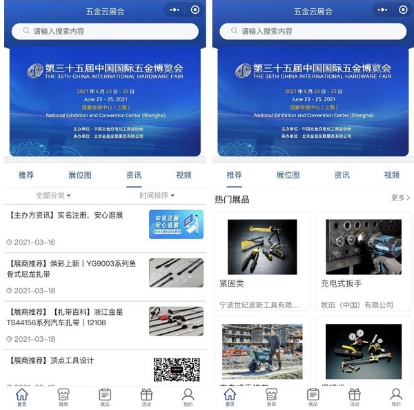 第三十五届中国国际五金博览会适时推出五金云展会,通过线下与线上融合,双线驱动,赋能线下展会。五金云展会共设首页、展品、资讯、参展商、消息提醒、我的六大模块,具有实时营销、多维展现、精准推流、智能匹配等功能特征,将为参展企业和采购企业带来更好的展会体验。