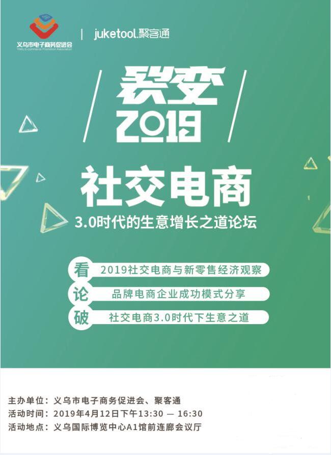 值得期待的是,聚客通作为本次博览会合作方将携手义乌电子商务促进会,于4月12日在义乌国际博览中心内同期举行——裂变·2019 社交电商3.0时代的生意增长之道论坛。届时将邀请众多知名电商企业,行业专家,共赴社交电商行业盛宴,智创未来。