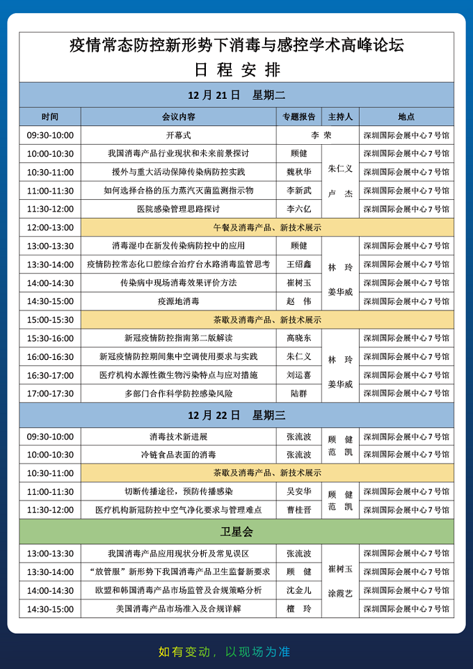 2021深圳国际医用消毒及感控设备展览会定于2021年12月21日-23日在深圳国际会展中心(宝安新馆)举办,展会产品涉及:医用消毒展区、消毒用品展区、消毒设备展区、消毒包装展区、感染控制及预防展区、消毒感控自动化展区等产品;展会坚持走专业化的特色发展道路,以推动产业升级、行业创新发展为己任,为国内外买家采购交流提供一个行业的饕餮盛宴!(本文内容版权归属聚展所有,未经同意,禁止转发)