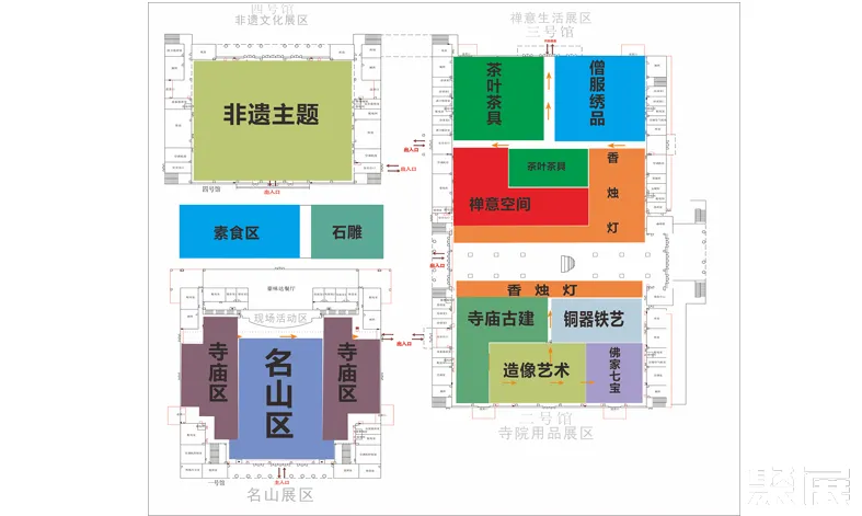 六大展区:佛教名山展区、寺院用品展区、禅意生活展区、佛文化及创意展区、非遗文化展区、户外石雕展区