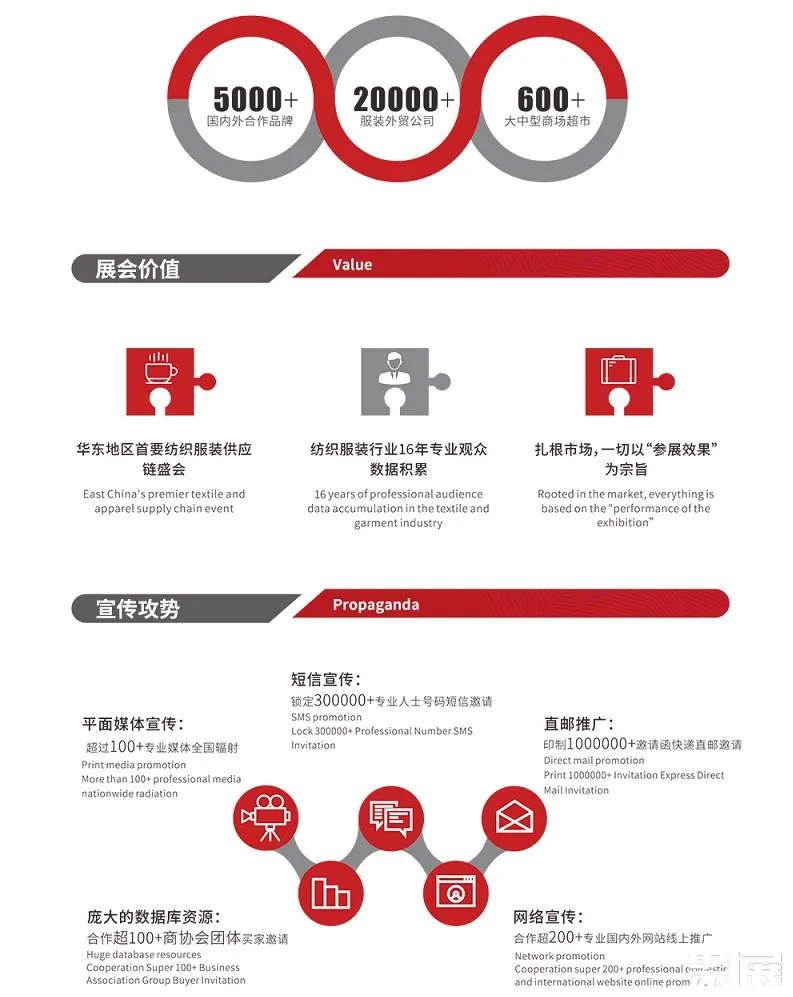 在全球经济一体化过程中,生产分工日益细化,服装业生产布局、结构调整和升级也紧跟全球价值链升级。SCM杭州国际纺织服装供应链博览会始终坚持以品牌发展的理念、时尚创意的展品、多元落地的活动,推动纺织服装产业的发展。博览会以系统性、前沿性、国际性为主导,坚持实效、共享、落地的发展方向,布局纺织服装全产业链衔接,把握纺织服装前沿脉络,接轨国际化发展方向,不断提升品牌价值、促进产业升级。自2006年首次举办至今,SCM杭州国际纺织服装供应链博览会数据库已累积国内外合作品牌5000多家,服装外贸公司20000多家,大中型商场超市600多家。