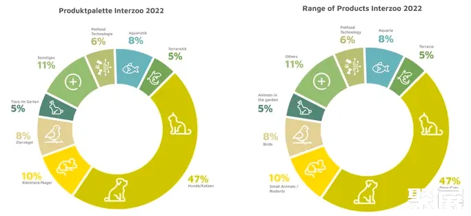 与过去一样,狗和猫用品占所提供产品的最大份额(47%),其次是小动物和啮齿动物(10%),然后是宠物鸟和宠物水族(各占8%)。专业宠物零售部门占6%,宠物食品技术也是如此。园林动物项目占5%,其他领域的份额较小,如学科领域文学、商店装修和包装。