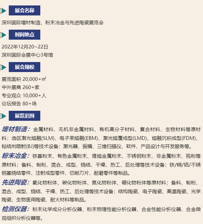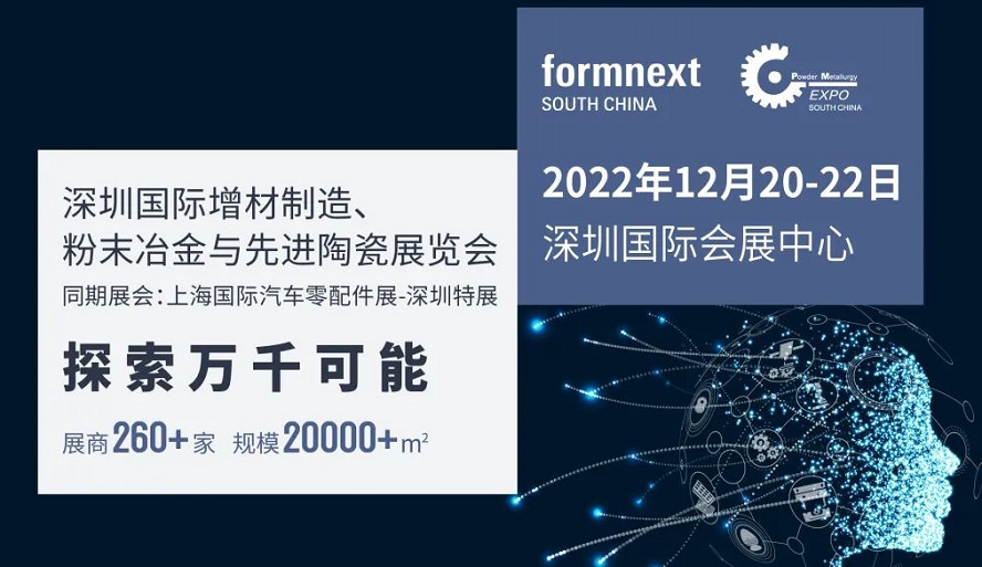 深圳国际增材制造、粉末冶金与先进陶瓷展览会(Formnext +PM South China)将于2022年12月20-22日在深圳国际会展中心(新馆)举办。将贯穿材料、粉末冶金、增材制造及后处理等一系列先进的材料、技术、设备以及产品,为中国大湾区乃至亚洲的制造业带来全新的商贸机遇。
