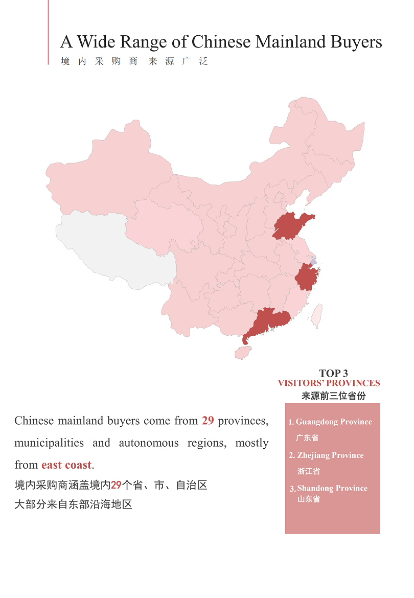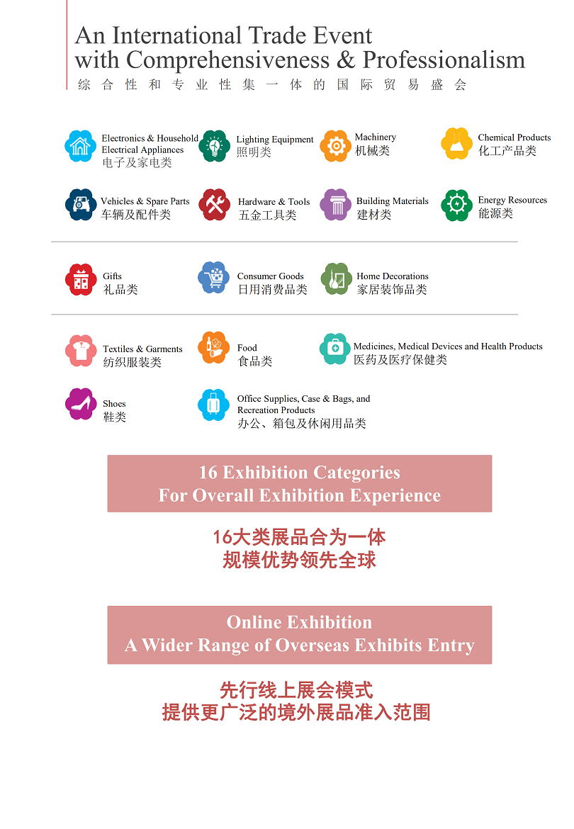 男女装、童装、内衣、运动服装及休闲装、毛皮及羽绒制品、服装辅料及配件、家用纺织品、纺织原料及面料、地毯及挂毯、食品、医药保健品、医疗器械、耗材、敷料、运动及旅游休闲用品、办公文具、鞋、箱包(本文内容版权归属聚展所有,未经同意,禁止转发)