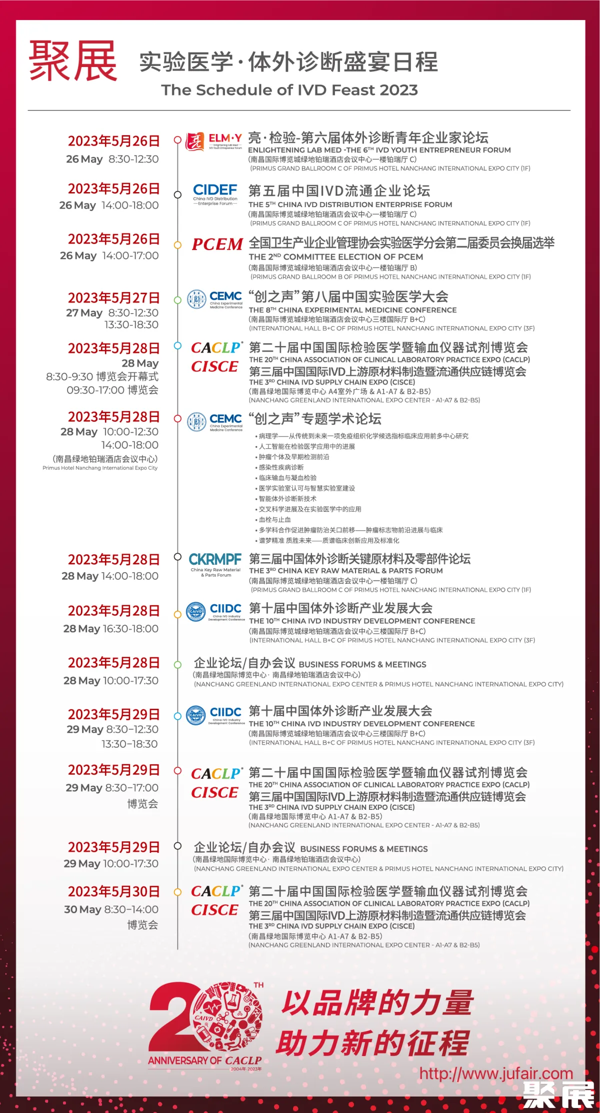 除了CACLP这一人气爆棚的旗帜性体外诊断盛会。第八届“创之声”中国实验医学大会(CEMC)暨病理、检验、认证、质量管理、微生物、输血、质谱、肿瘤筛查、分子诊断等专题学术论坛。第十届中国体外诊断产业发展大会(CIIDC)暨亮·检验-第六届体外诊断青年企业家论坛(ELM·Y)、第五届中国IVD流通企业论坛(CIDEF)、第三届中国体外诊断关键原材料及零部件论坛(CKRMPF)以及百余场企业论坛/自办会议等也将于5月26日-30日同期举行。