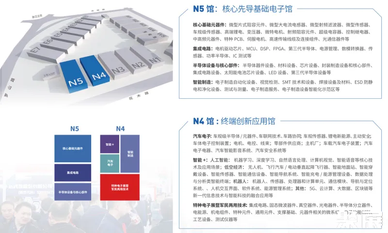 N1-N5馆:主要展示半导体材料、设备及人工智能技术,包含潮州三环、台芯电子等元器件企业