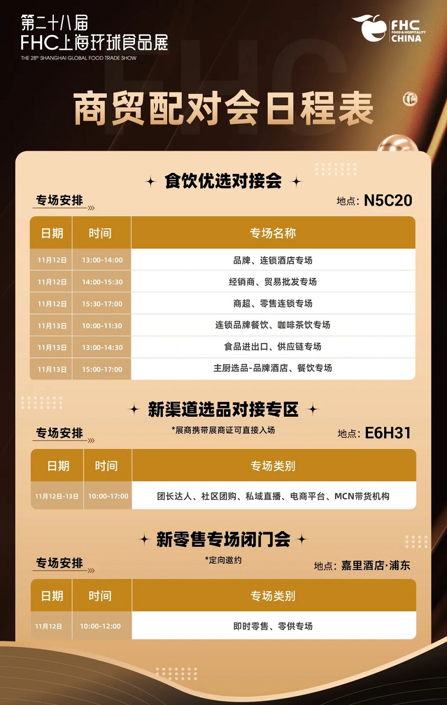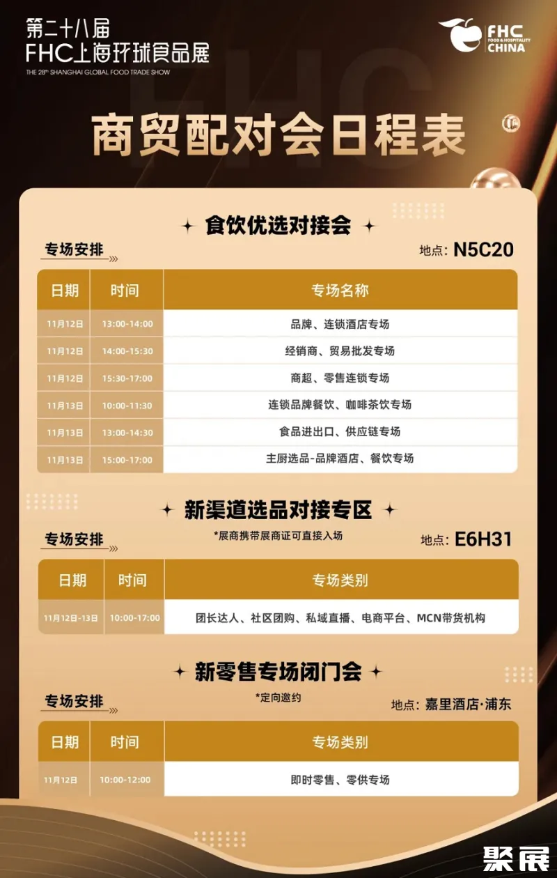 为提升贸易效率,FHC打造“食饮优选对接会”,通过百万级数据库与精准调研实现供需高效匹配,已吸引京东、叮咚买菜、本来生活、中粮、东方国际等头部平台参会。活动涵盖品牌连锁、商超零售、电商团购、餐饮咖啡、供应链等多维场景,助力展商与买家精准成交。