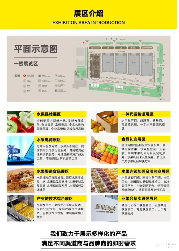 本届博览会全新升级,特设食品礼盒展区、水果渠道食品展区,与水果品牌展区、一件代发货源展区、水果电商展区、水果连锁加盟及服务商展区、产业链技术综合展区、亚果会帮卖联盟展区,全方位展示水果全产业链风貌,通过水果与食品的跨界融合,帮助水果门店渠道掌握最新的水果零食产品和消费需求,一次性接触到优质水果资源、深加工产品、产业链技术、休闲食品、饮品等,满足多元化采购需求。