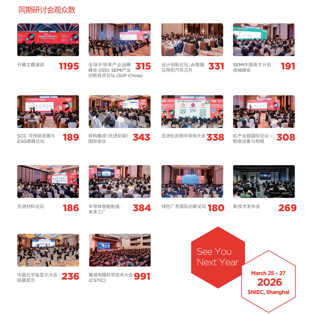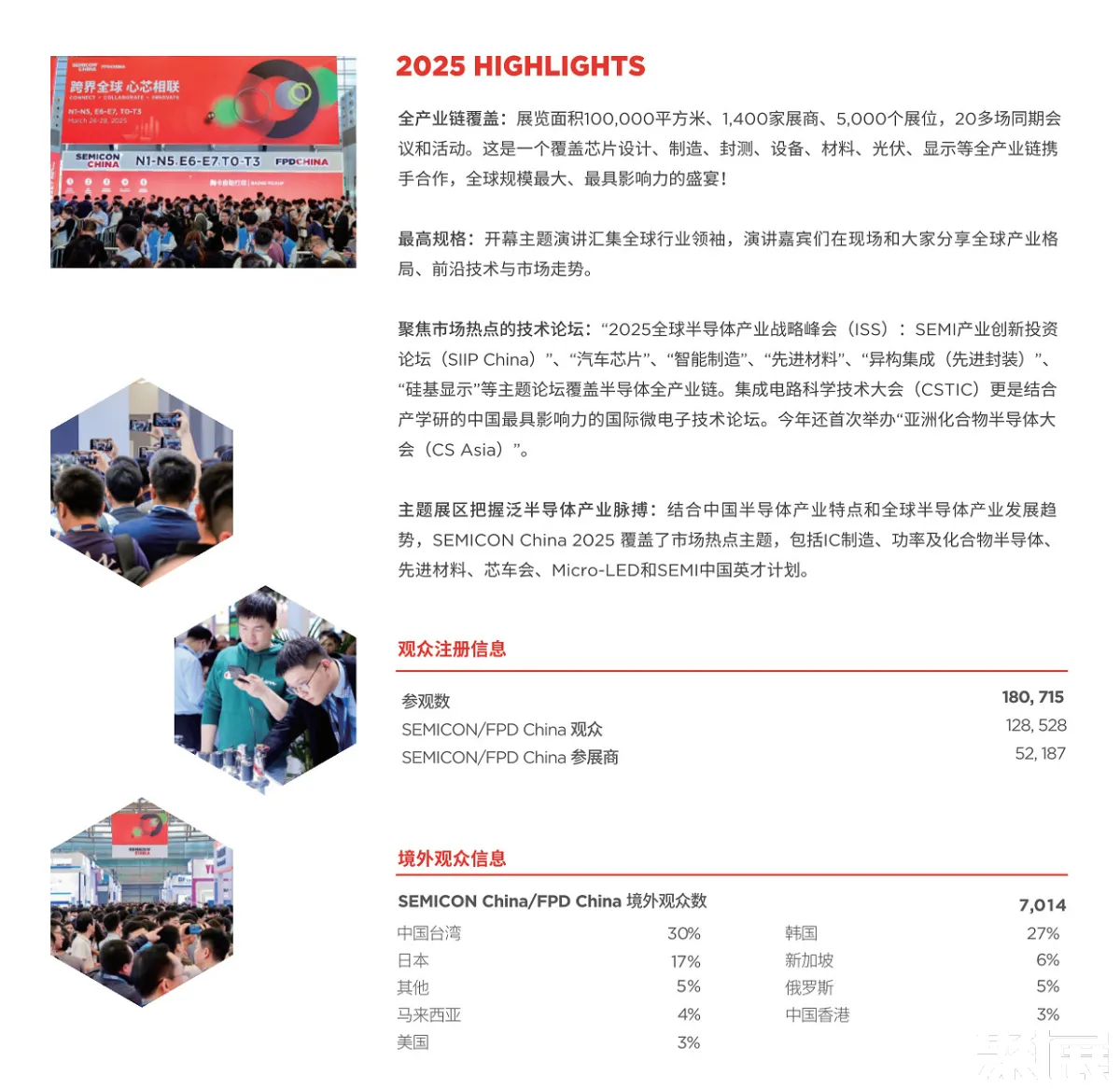 2026上海半导体展将于2026.03.25-03.27在上海新国际博览中心举办,为半导体行业101500名观众与1116家参展企业提供了一个宝贵的交流平台,探索最新技术、洞察行业趋势,并与行业领袖进行深入交流。 点击立即申请上海半导体展展位 点击购买上海半导体展展商名录(会刊) 上海半导体展门票预约(含早鸟票、展期票、单日票和限时免费票)