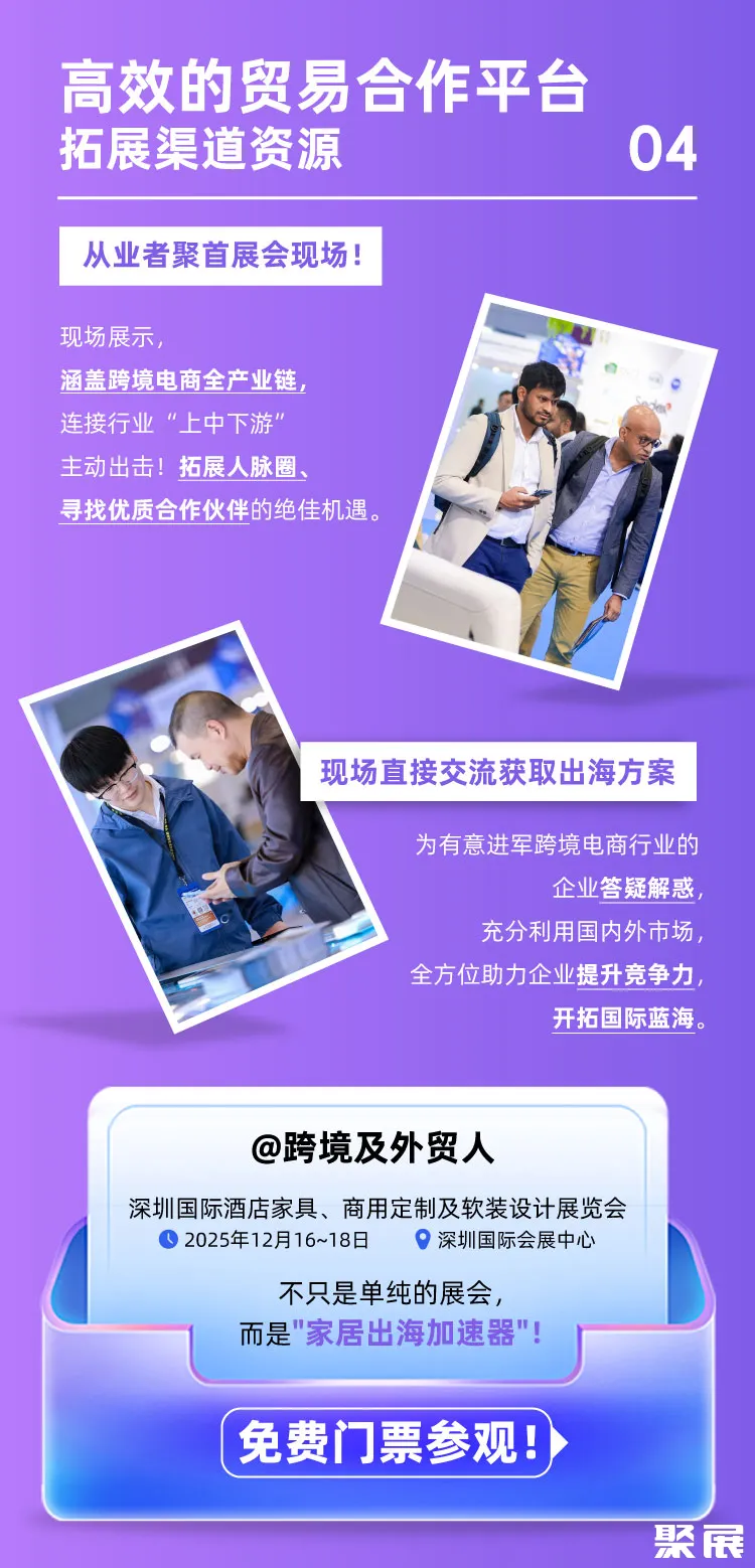 2025深圳国际酒店家具、商用定制及软装设计展览会,“跨境电商家居”版块聚焦中国家居品牌出海和东南亚新兴市场不断释放潜力的广阔蓝海。无论您是寻求跨境家居供应链、服务资源,还是前言趋势解读,都能在此找到高效的出海路径。
