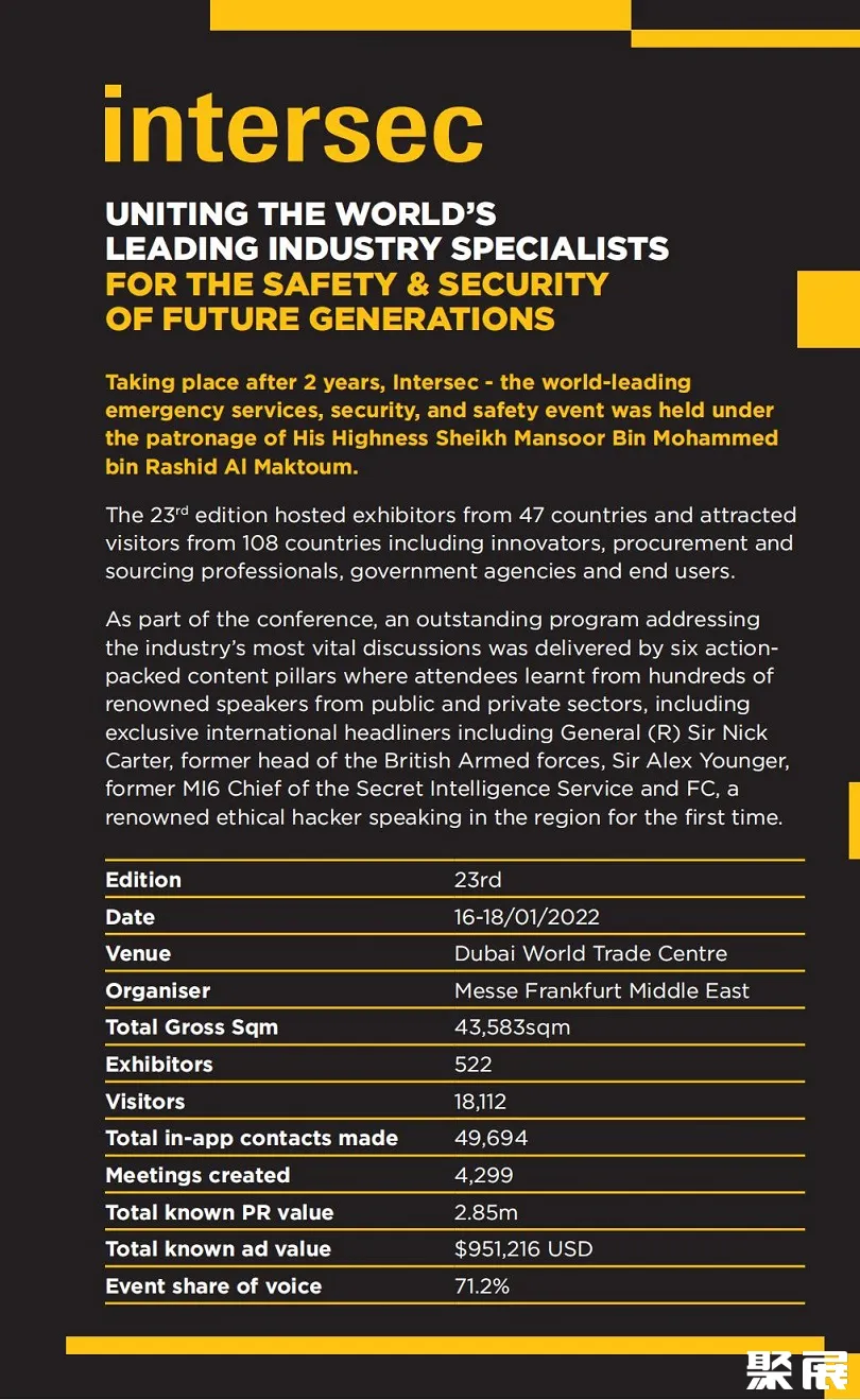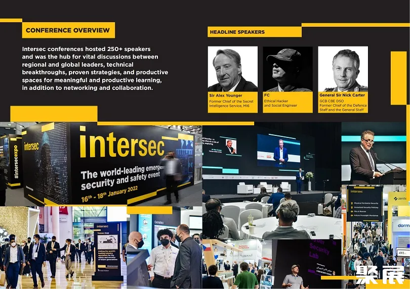聚展多次组织了部分优质企业参展!中东迪拜安防及消防展览会(INTERSEC)同期将举办多场高规格会议,包括国际安全领袖峰会、消防与救援大会、健康与安全会议、门禁控制论坛等。议题将涵盖AI在警务中的应用、应急响应预测分析、高风险作业人员防护、智慧基础设施安全等前沿方向。