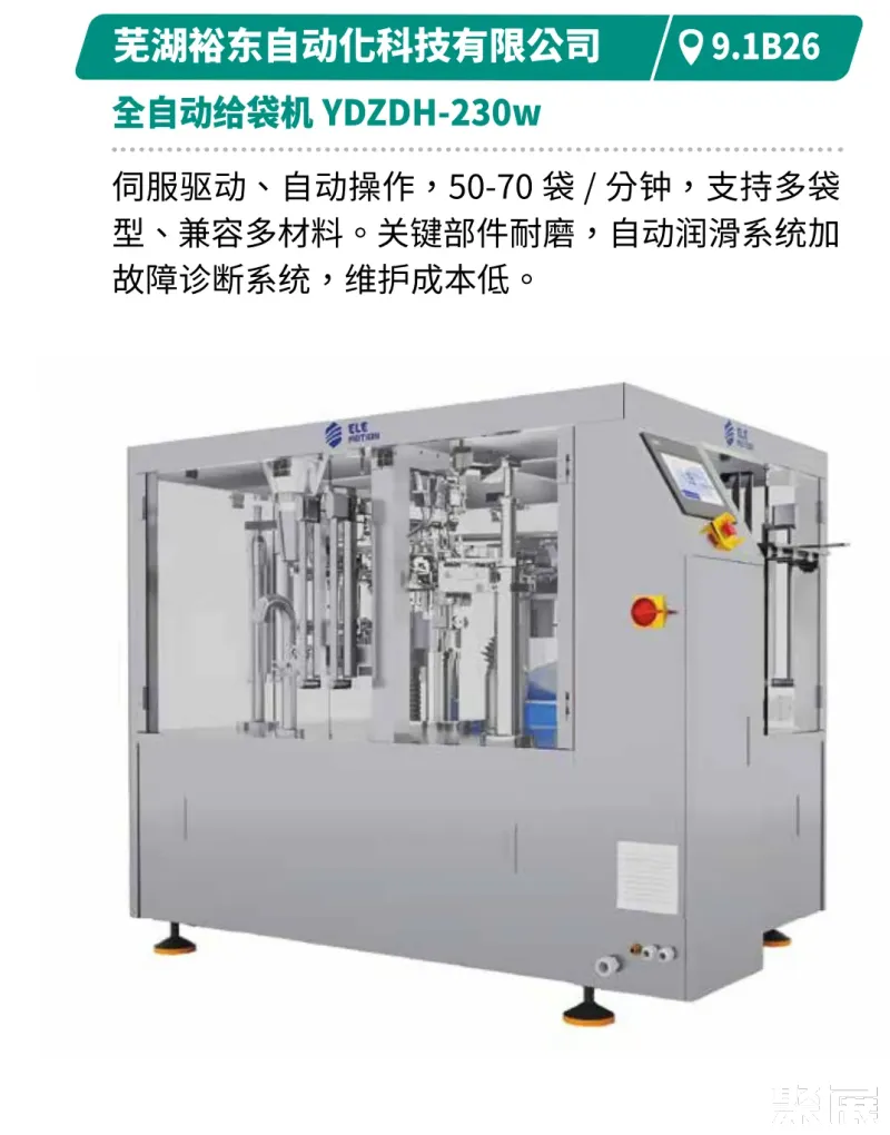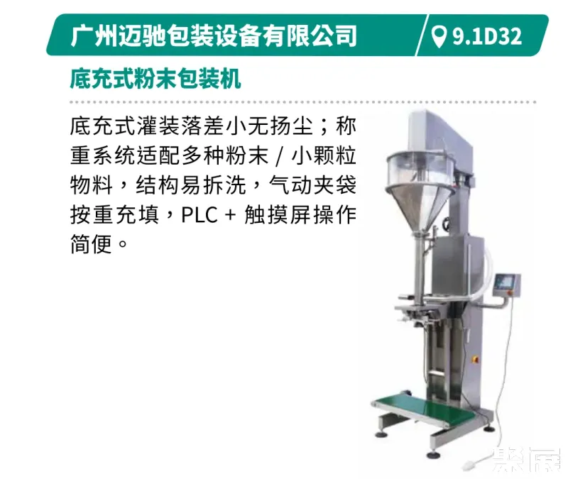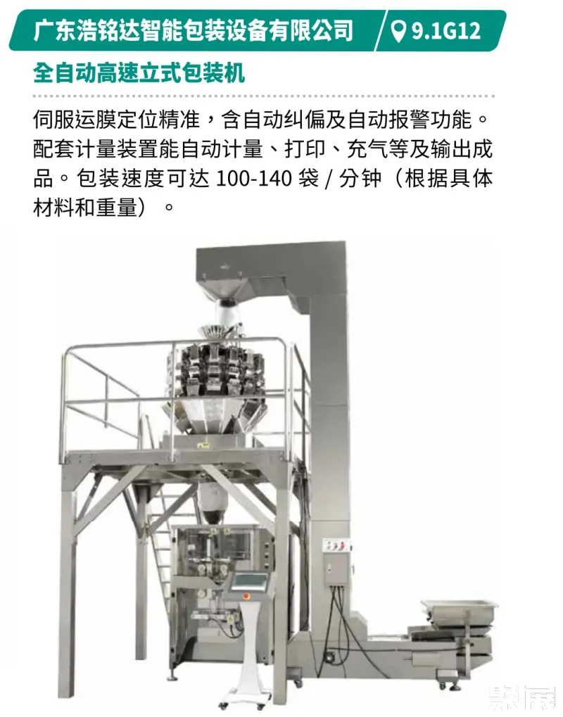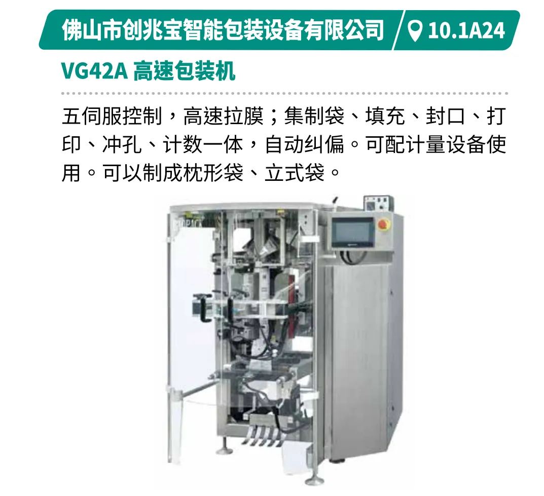 展示创新、高效、节能的食品包装技术,包括灵活换线、柔性生产及数智化生产解决方案。如裕东全自动给袋机支持多袋型、多材料兼容,速度达50-70袋/分钟。浩铭达高速立式包装机集自动计量、打印、充气于一体,包装速度100-140袋/分钟,具备自动纠偏与报警功能。创兆宝的VG42A高速包装机集制袋、填充、封口、打印、冲孔、计数于一体,可制枕形袋、立式袋。厦门字笙粉剂包装机可自动完成制袋至计数全流程,速度30-70袋/分钟。迈驰底充式粉末包装机底充式灌装减少扬尘与落差,适配多种物料,结构易清洗,操作简便。