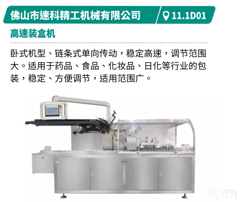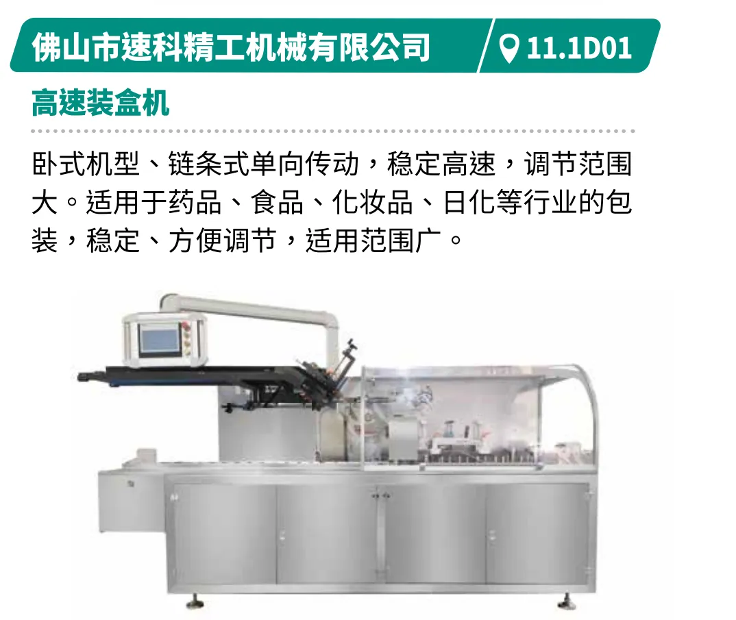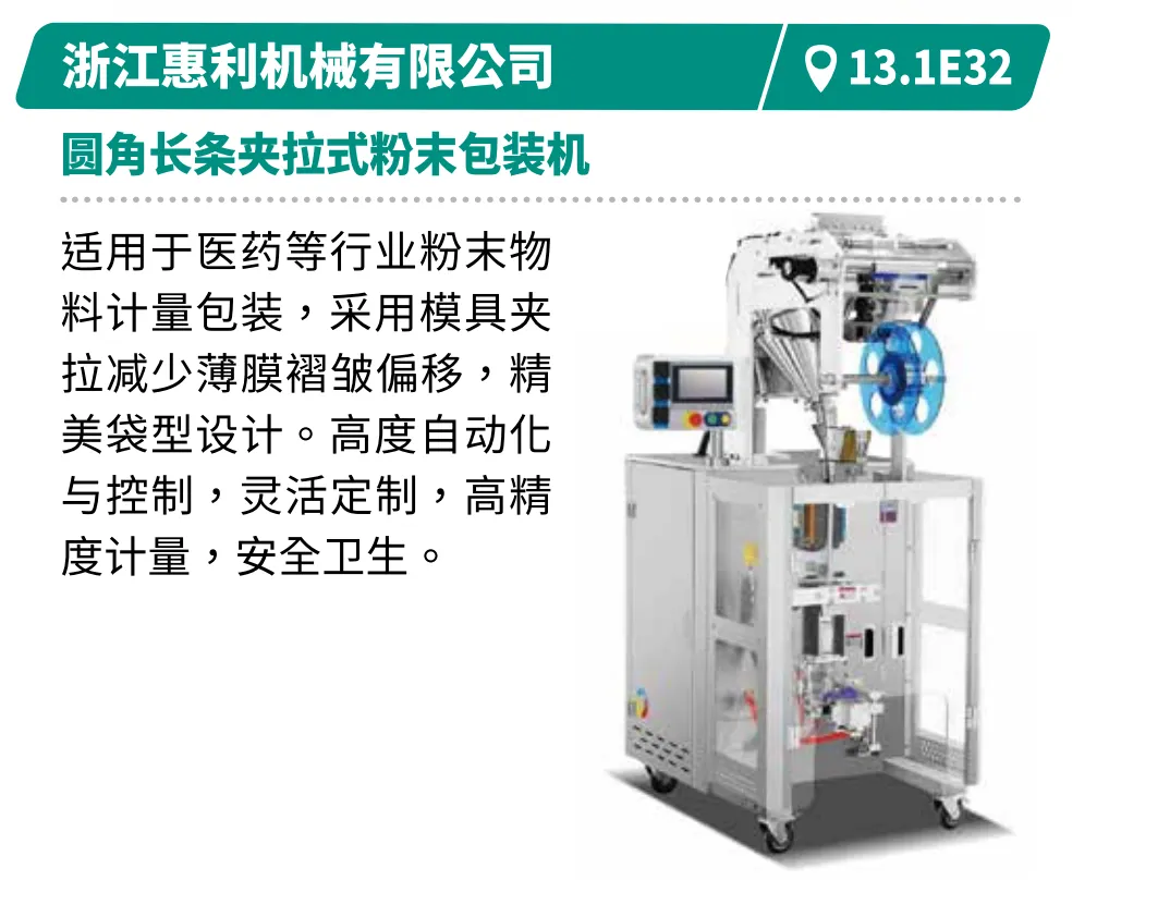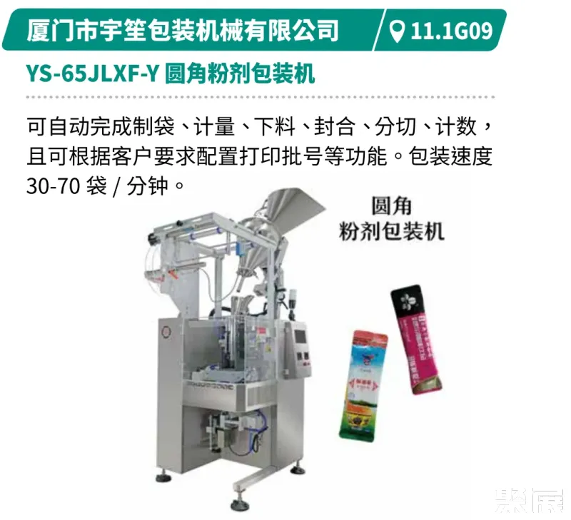 展示创新、高效、节能的食品包装技术,包括灵活换线、柔性生产及数智化生产解决方案。如裕东全自动给袋机支持多袋型、多材料兼容,速度达50-70袋/分钟。浩铭达高速立式包装机集自动计量、打印、充气于一体,包装速度100-140袋/分钟,具备自动纠偏与报警功能。创兆宝的VG42A高速包装机集制袋、填充、封口、打印、冲孔、计数于一体,可制枕形袋、立式袋。厦门字笙粉剂包装机可自动完成制袋至计数全流程,速度30-70袋/分钟。迈驰底充式粉末包装机底充式灌装减少扬尘与落差,适配多种物料,结构易清洗,操作简便。