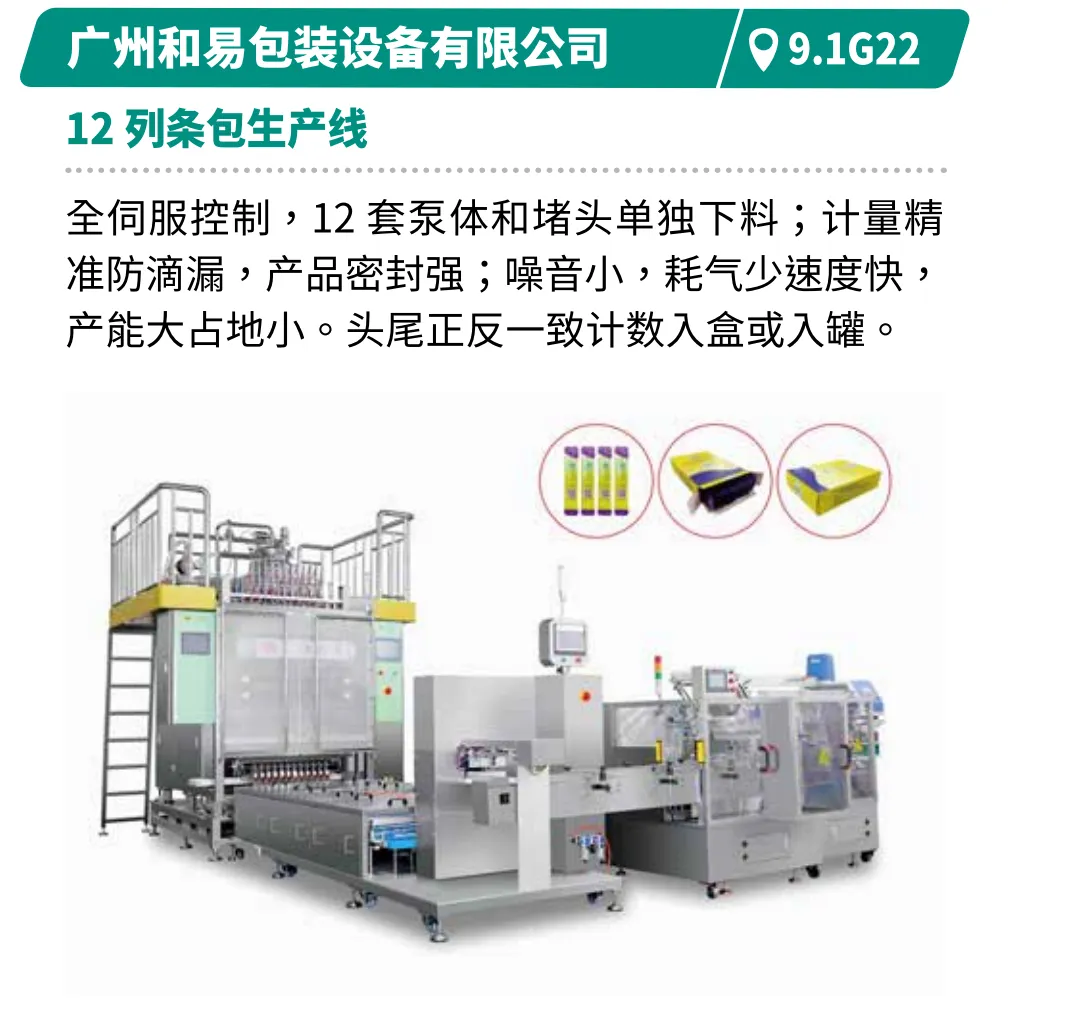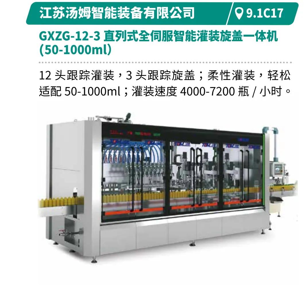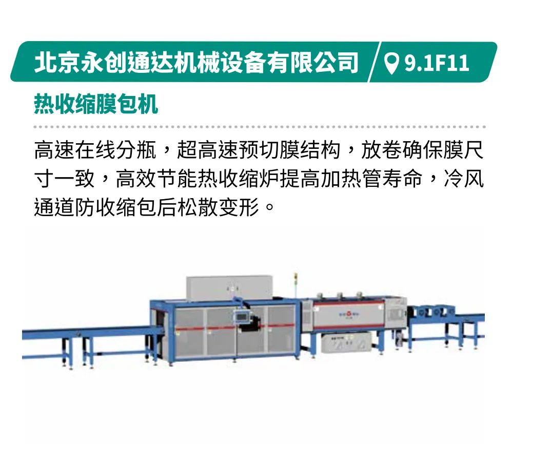 展示从制瓶到封箱的全产业链技术,满足饮品、乳品高端化需求。如江苏汤姆的直列式灌装旋盖一体机柔性适配50-1000ml,速度4000-7200瓶/小时。深圳和力泰的循环式灌装机可一键调机,换产快,精度高,满足饮品、乳品、日化用品等高端化需求。广州和易的12列条包生产线计量精准防滴漏,产品密封性强,速度快且占地小。北京永创通达的热收缩膜包机可实现高速在线分瓶,高效节能收缩炉提升稳定性。