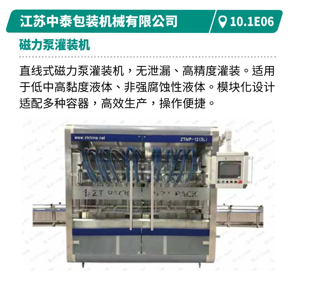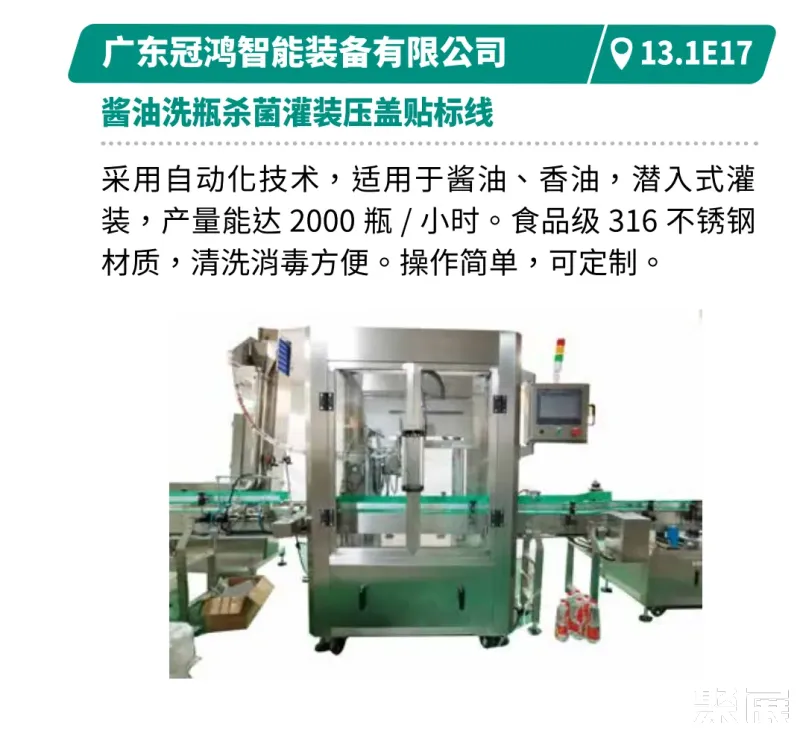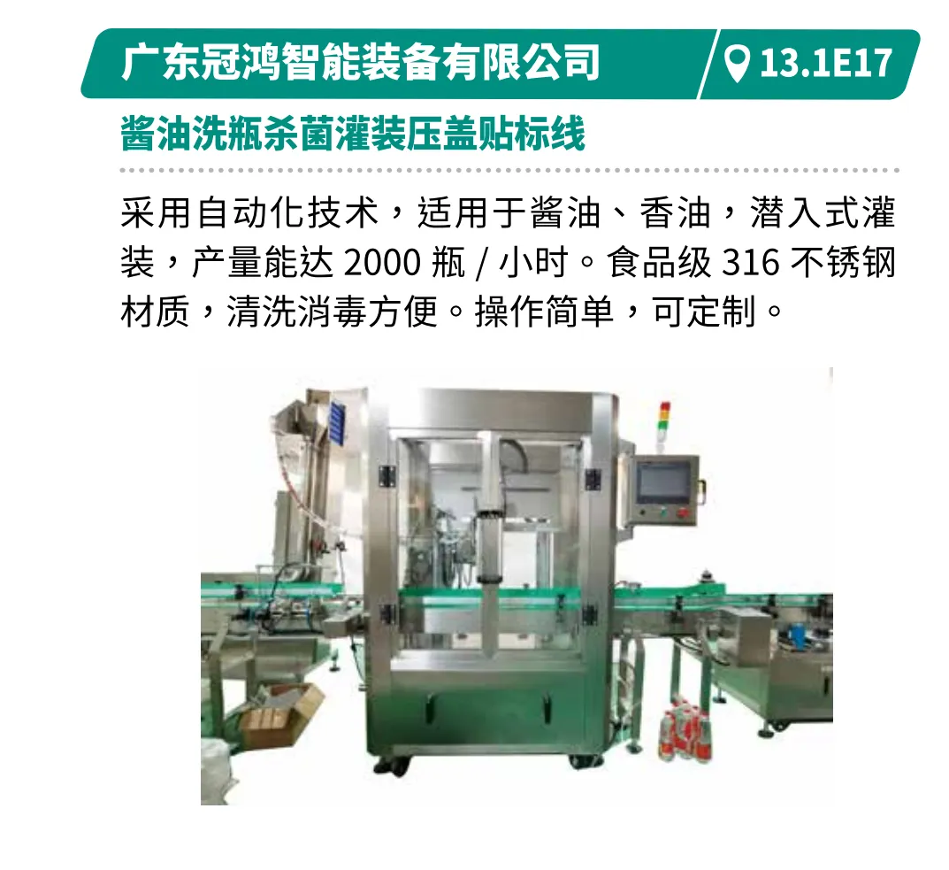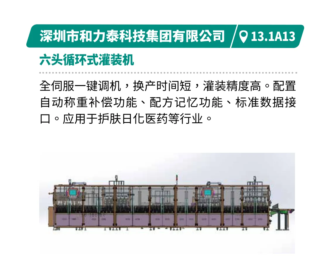 展示从制瓶到封箱的全产业链技术,满足饮品、乳品高端化需求。如江苏汤姆的直列式灌装旋盖一体机柔性适配50-1000ml,速度4000-7200瓶/小时。深圳和力泰的循环式灌装机可一键调机,换产快,精度高,满足饮品、乳品、日化用品等高端化需求。广州和易的12列条包生产线计量精准防滴漏,产品密封性强,速度快且占地小。北京永创通达的热收缩膜包机可实现高速在线分瓶,高效节能收缩炉提升稳定性。