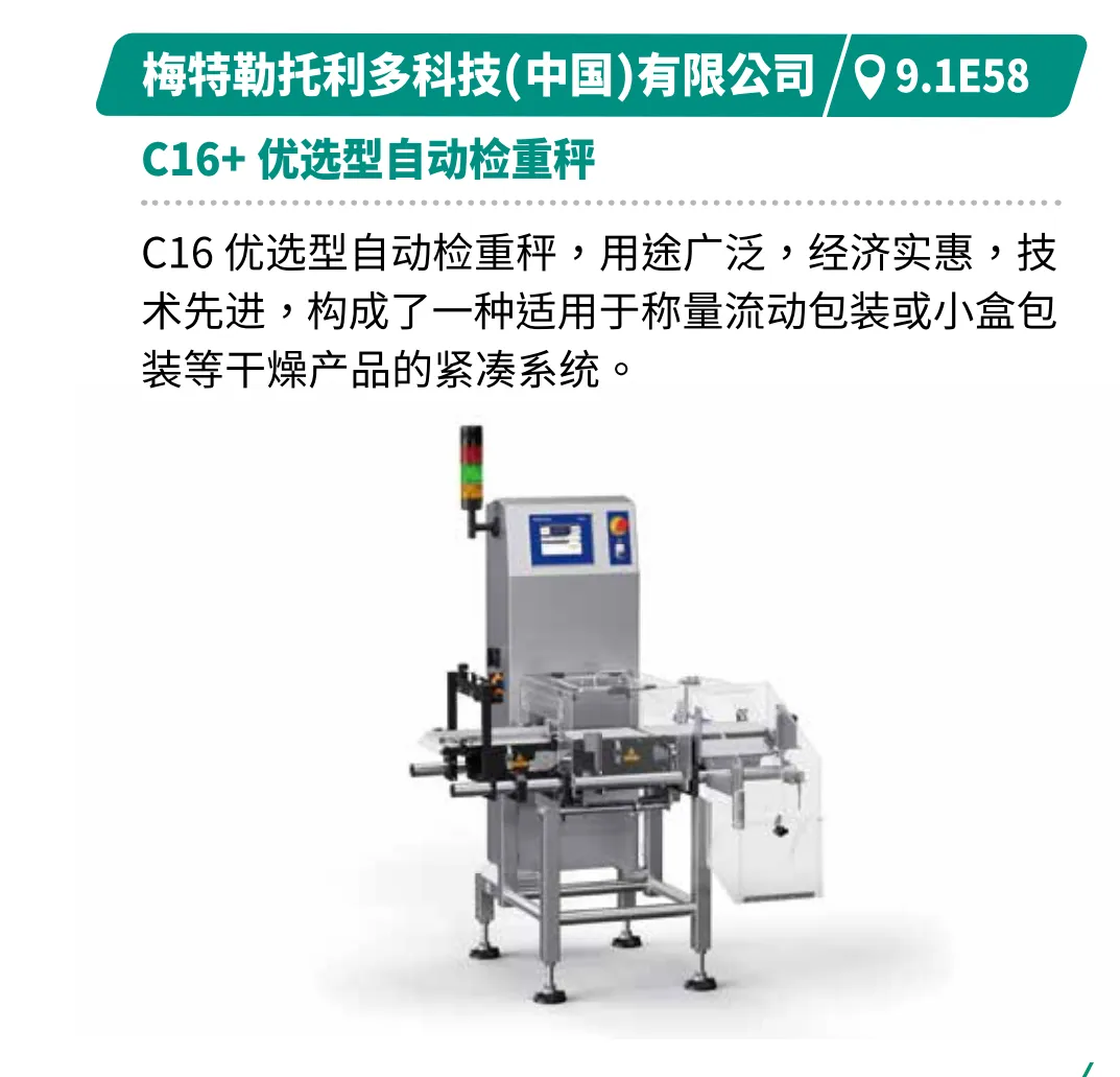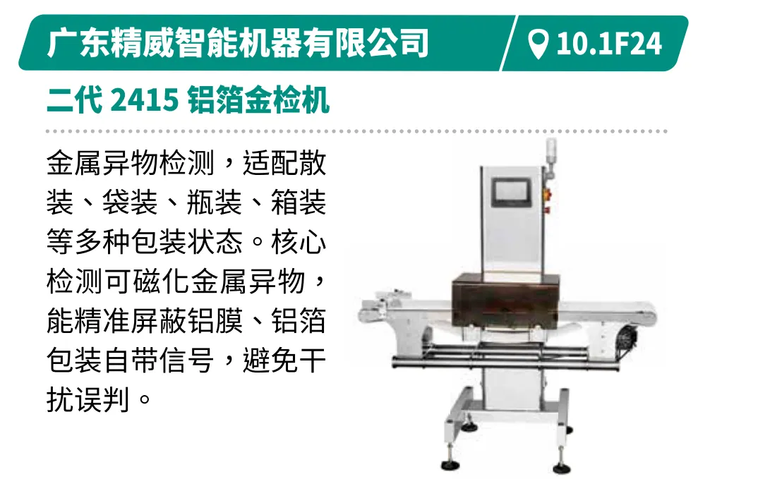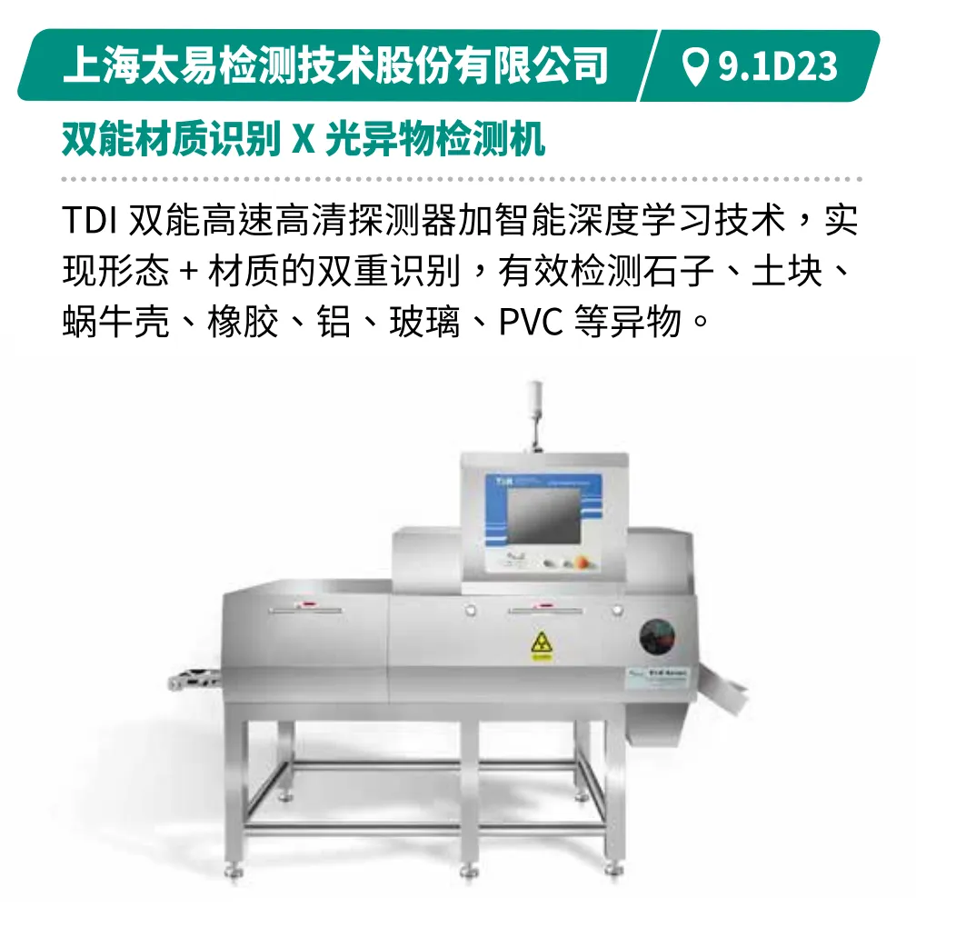 集成高精度称重、异物检测、AI视觉检测与数字化追溯技术,筑牢食品安全防线。如梅特勒托利多的C16+自动检重秤专为干燥产品流动包装称重而优化。上海太易TDI双能探测器,结合智能深度学习,实现形态与材质双重识别,精准检测多种异物。广东精威的二代铝箔金检机可精准屏蔽铝膜包装干扰,有效检测各类金属异物,适配多种包装状态。