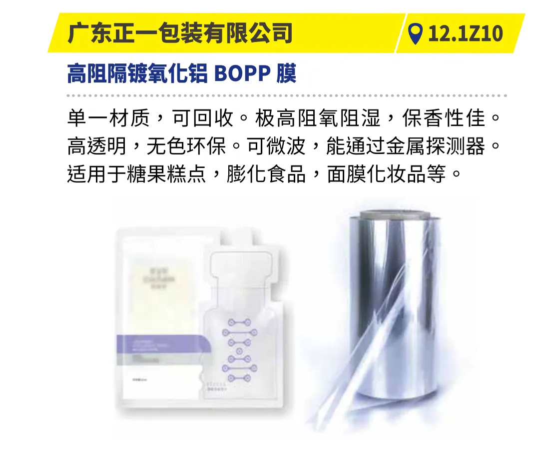 集中呈现高阻隔、可降解、活性智能保鲜等材料科技,以及易撕口、精准计量等提升用户体验的巧妙设计。如广东丹青印务畅吸三头吸嘴袋,专为液体糖果设计,三吸嘴分装防污染,高阻隔材料锁鲜,支持定制印刷。华硕新材料的高阻隔薄膜,专业解决食品保鲜、防褐变问题,广泛应用于预制菜、休闲零食等常温包装。
