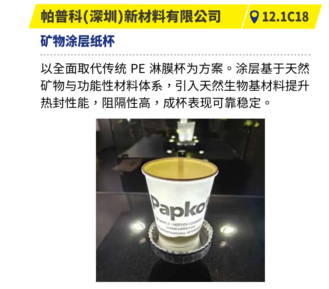 展示快速换型、自动化设备及全套绿色包装材料,聚焦便利与安全创新设计。如石图里包装的117杯系列,100%全新材料,高透明、防雾、轻便耐用,适用于多种冷鲜食品。帕普科矿物涂层纸杯,以天然矿物涂层取代传统PE淋膜,阻隔性高,热封性能可靠,更环保。