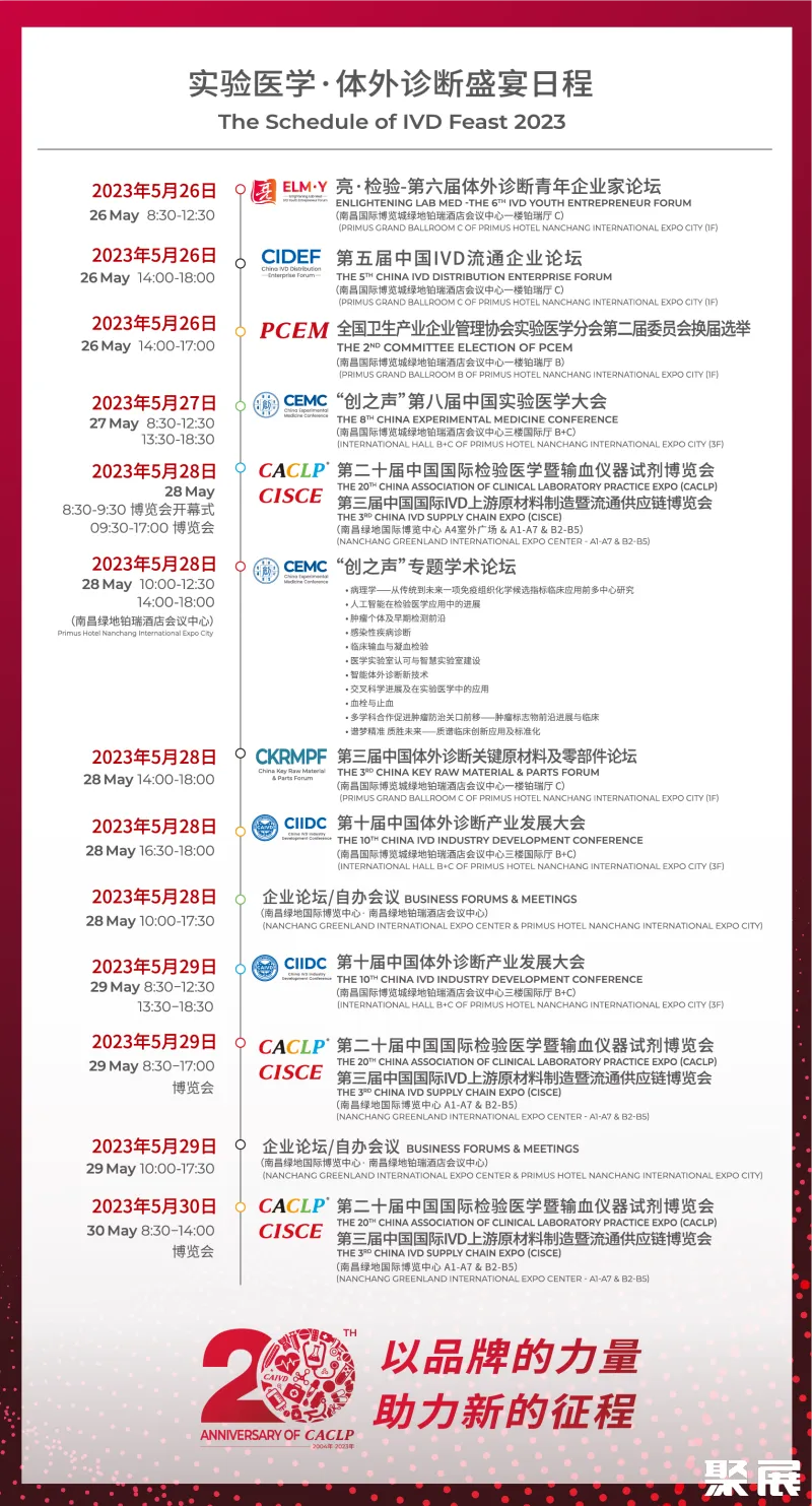 实验医学·体外诊断盛宴与你共精彩除了CACLP这一人气爆棚的旗帜性体外诊断盛会。第八届“创之声”中国实验医学大会(CEMC)暨病理、检验、认证、质量管理、微生物、输血、质谱、肿瘤筛查、分子诊断等专题学术论坛。第十届中国体外诊断产业发展大会(CIIDC)暨亮·检验-第六届体外诊断青年企业家论坛(ELM·Y)、第五届中国IVD流通企业论坛(CIDEF)、第三届中国体外诊断关键原材料及零部件论坛(CKRMPF)以及百余场企业论坛/自办会议等也将于5月26日-30日同期举行。