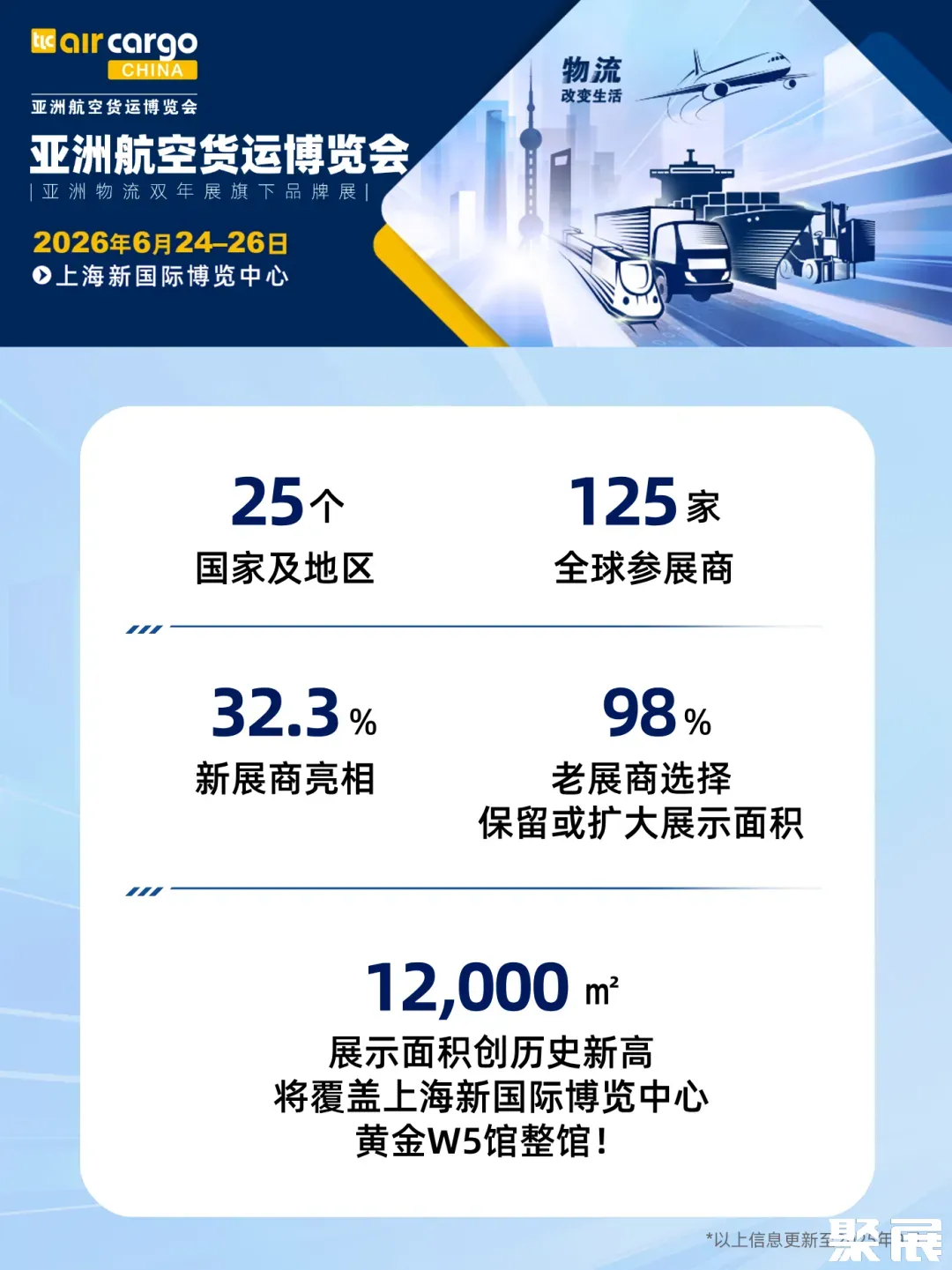 上海国际航空货运展览会(Air Cargo China)是亚洲最大规模、最具影响力的航空货运展览会。将顶级物流服务提供商和客户集中在一起,满足实际需求。您可以找到量身定制的物流解决方案,并与B2B平台的未来合作伙伴见面。(本文内容版权归属聚展所有,未经同意,禁止转发)