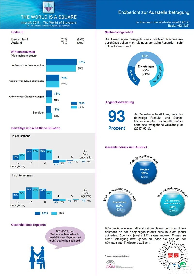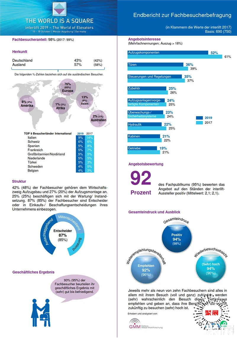 作为世界电梯行业的顶级展会,势必会吸引更多的展商与观众参与这一行业盛会。德国纽伦堡电梯展览会(INTERLIFT)众多的客户群体和极佳的商业机会,使展会取得满意的效果,受到观众和参展商的一致赞誉。(本文内容版权归属聚展所有,未经同意,禁止转发)