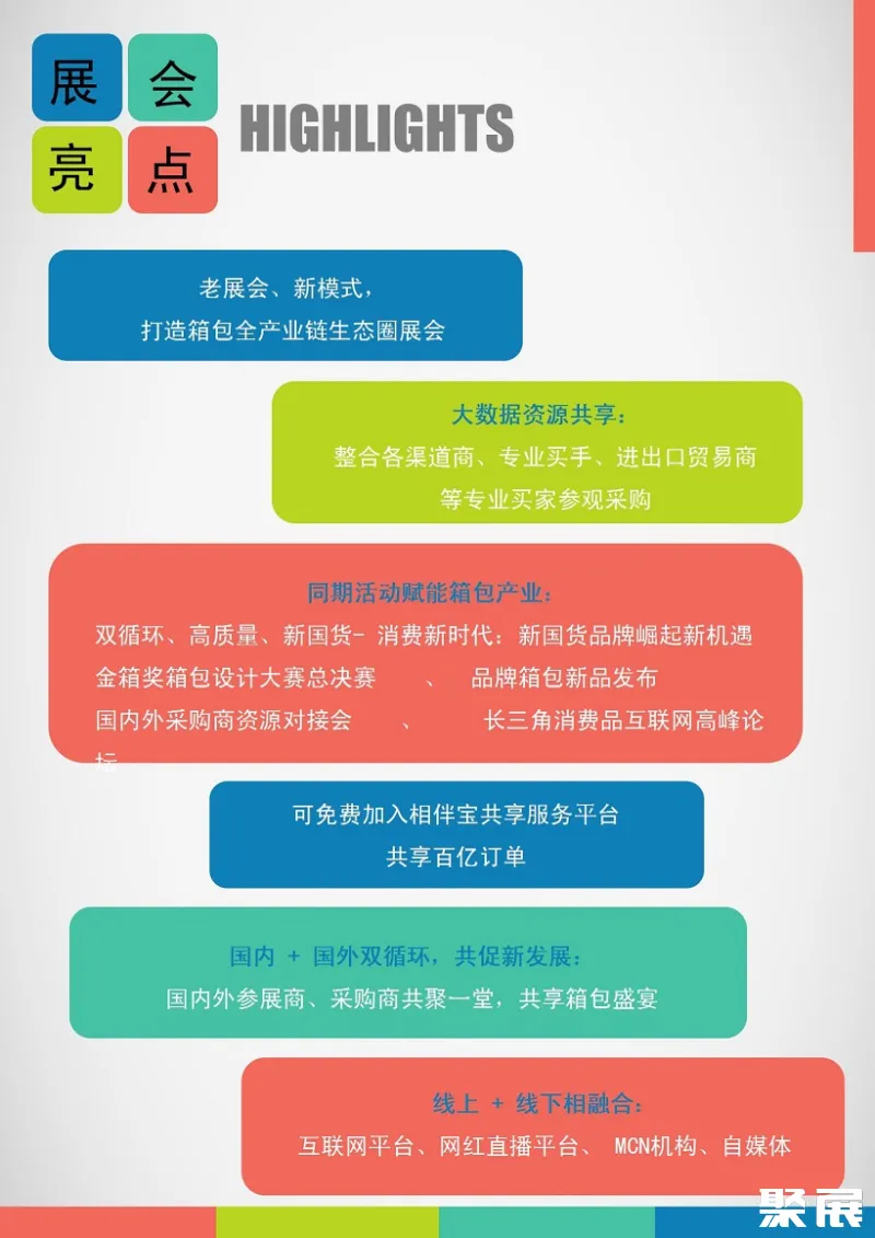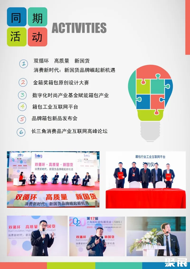 上海国际箱包展览会(SHANGHAI BAG SHOW)作为国内知名的箱包皮具展贸平台之一。由上海市皮革技术协会、中国轻工工艺品进出口商会、中国皮革协会箱包皮具专委联合举办。(本文内容版权归属聚展所有,未经同意,禁止转发)