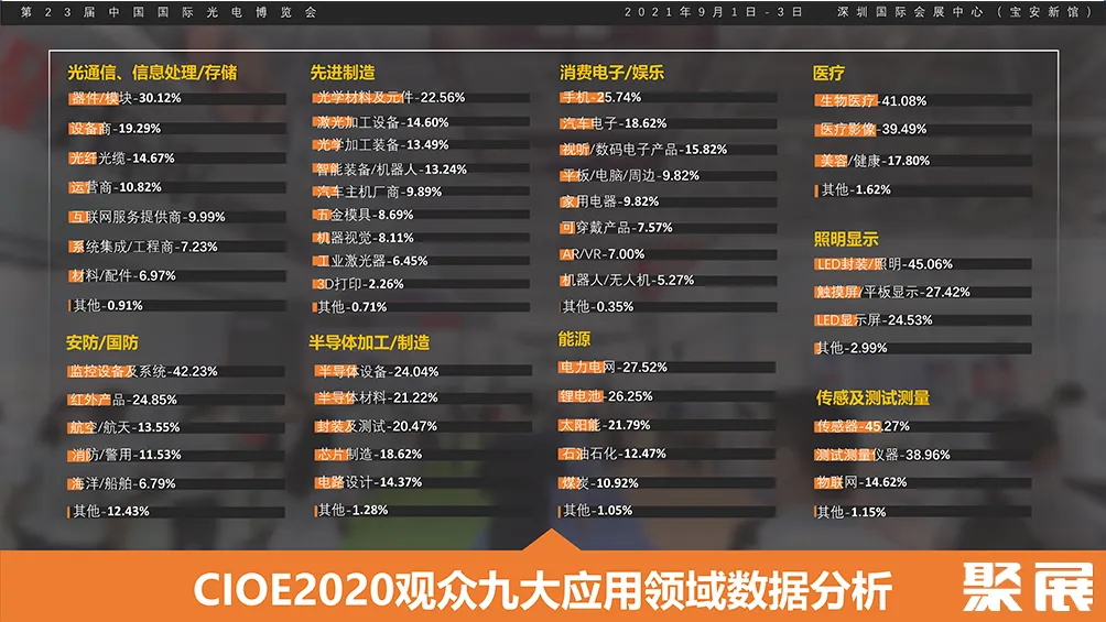 深圳激光技术及智能制造展CIOE同期举办中国光博会CIOE,紧贴市场发展,细分观众数据实现精准营销匹配资源,展示前沿智能制造技术及创新综合解决方案。覆盖光通信、激光、红外、精密光学、光电创新、军民融合、光电传感、数据中心等光电产业链版块。