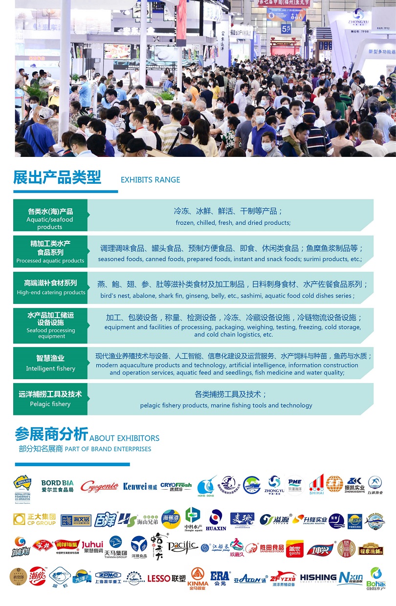 福州渔业及水产养殖展-福建渔博会(Fisheries Expo)凭借福建水产品强大的产地优势和品牌优势,以及发达的冷链物流和业内专业采购商的广泛参与,已成为中国渔业全产业链展示平台。展品覆盖水产养殖、捕捞、加工、食材、食品和包装机械、休闲渔业等等。