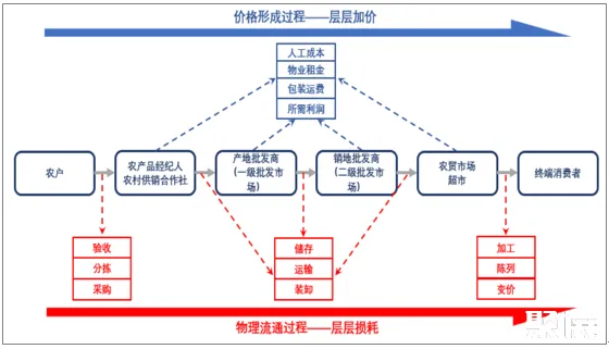 生鲜作为农副产品的衍生品,上游为农产品生产。不同于美国农业的规模化生产,我国农村土地制度和相对贫瘠的人均耕地资源,决定我国 农业生产长期以个体“小农生产”为主,生产经营分散、集中度较低,加之我国农业自动化技术还有待发展,因而从源头决定了生鲜品类难以标准化的特性。由于极度分散的上游生产,又缺乏类似日本较为发达的农协体制,我国以批发市场为主的流通环节发挥的“集散”作用更为凸显。在农批市场主导的传统农产品流通体系下,分散于各农户的农产品先经过农产品经纪人收购,并在产地批发市场聚集、交易、定价,再经二级批发商、销地批发商运输分销,最终通过农贸市场、超市等渠道到达终端消费者。