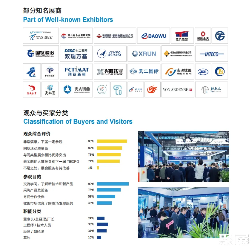 中国国际钛业展览会(TIEXPO)秉持长期为行业发展服务为宗旨,以市场需求为导向,深度整合行业资源,不断创新办展模式,提升展会运行质量,影响力和关注度逐年增强。钛博会吸引了来自德国、美国、俄罗斯、意大利、日本、韩国等十多个国家和地区的近223家单位参展,国内外专业观众达21600人。