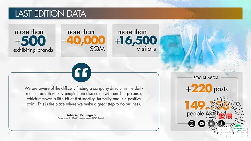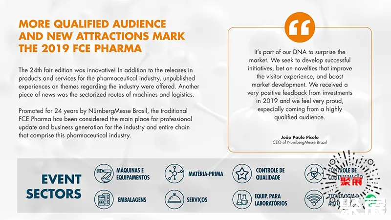 圣保罗医药原料展(FCE Pharma)是南美洲首屈一指的制药技术展览会。不仅通过推出趋势、产品和服务,还通过案例讨论、会议和讲座分享内容和经验,在医药行业的发展中发挥着重要作用。(本文内容版权归属聚展所有,未经同意,禁止转发)